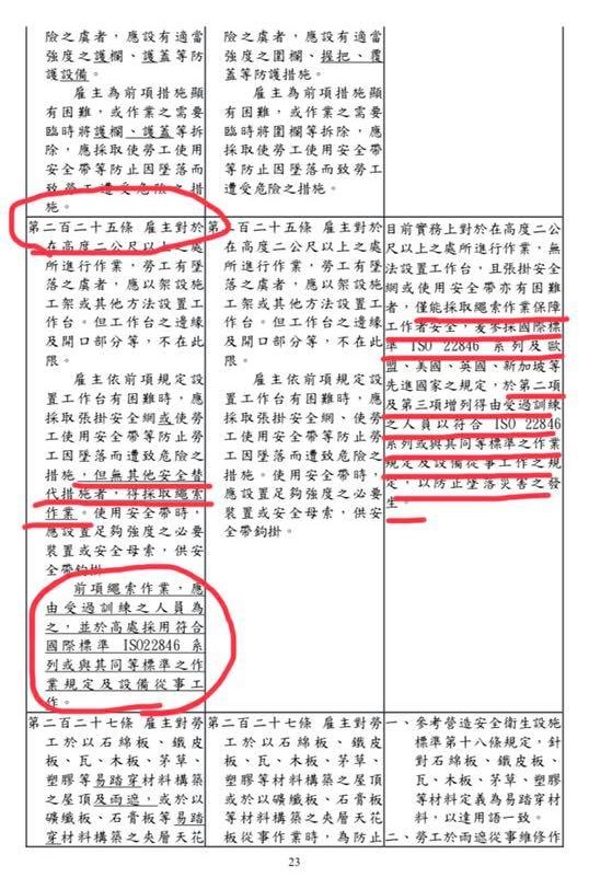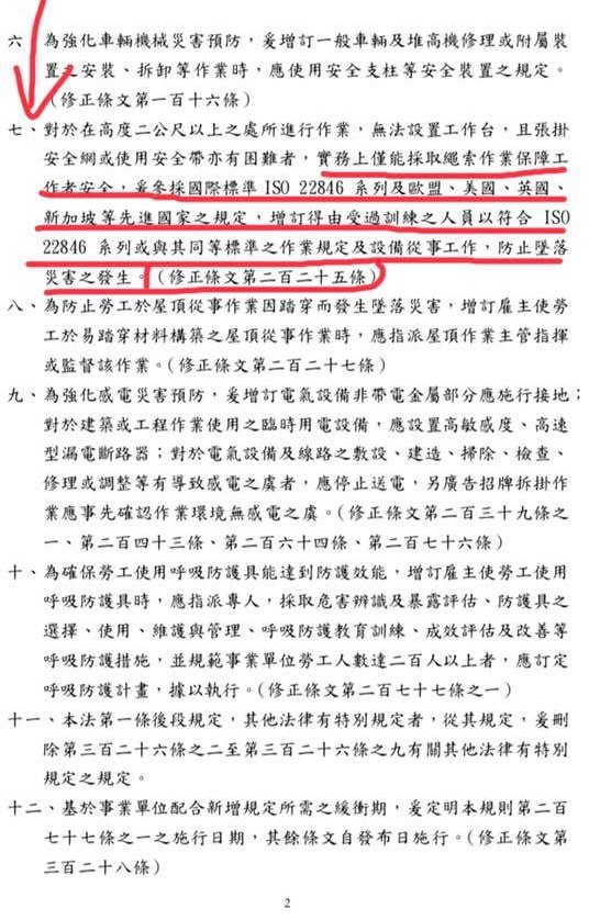 臺灣官方終於承認工業繩索技術,並於2019年4月30日公布,將ISO 22846正式寫入『職業安全衛生設施規則』中,修正條文對照表如下連結:
