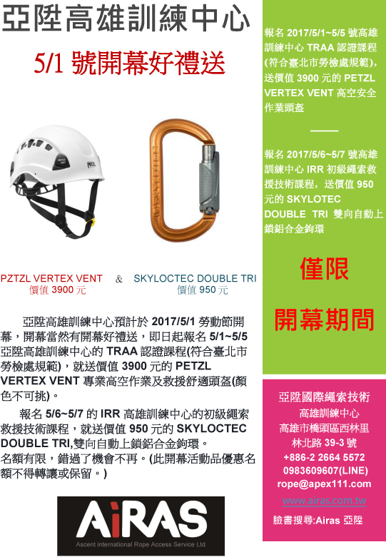 上課地點:高雄AiRAS亞陞繩索技術訓練中心(室內空間) ---高雄市橋頭區西林里林北路39-3號